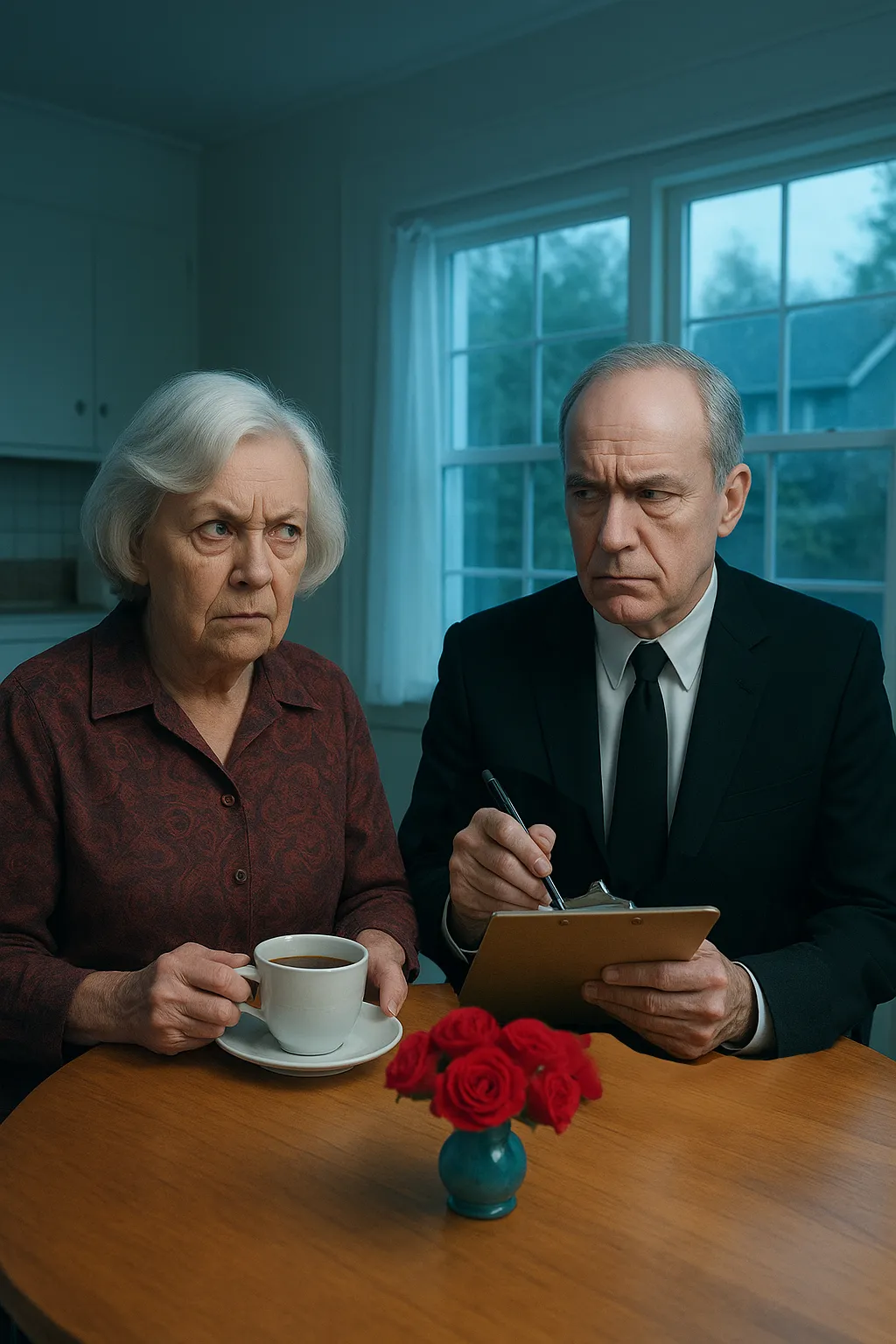 The kitchen, dining area, and front room glow gently with morning softness, suggesting the remains of a daily ritual she performs out of habit, not purpose.